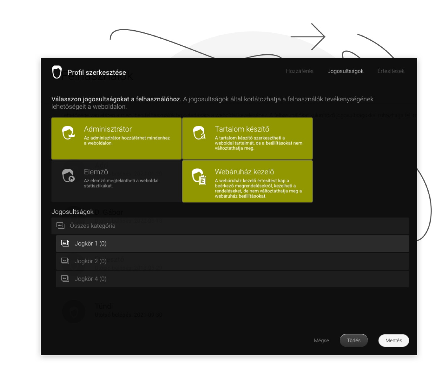 A felhasználókat különböző egyedi jogosultsággal láthatjuk el, ezzel elérve, hogy mindenki a saját területére tudjon fókuszálni a tökéletes tartalomelőálltás területén